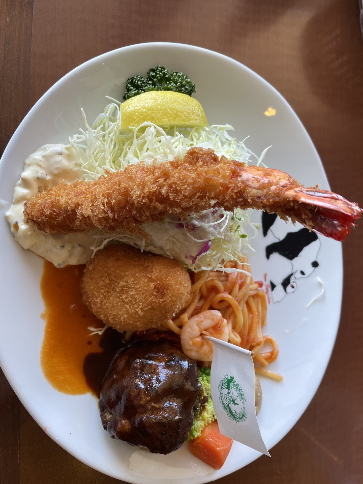 運ばれてきたパンダプレートは、大きなエビフライ、カニクリームコロッケ、ハンバーグにナポリタンと、みんなが大好きなものばかりが勢ぞろい!まさに“大人様ランチ”と呼ぶにふさわしい豪華さです。エビフライ定食とハンバーグ定食、どちらにしようか迷う必要もありません。