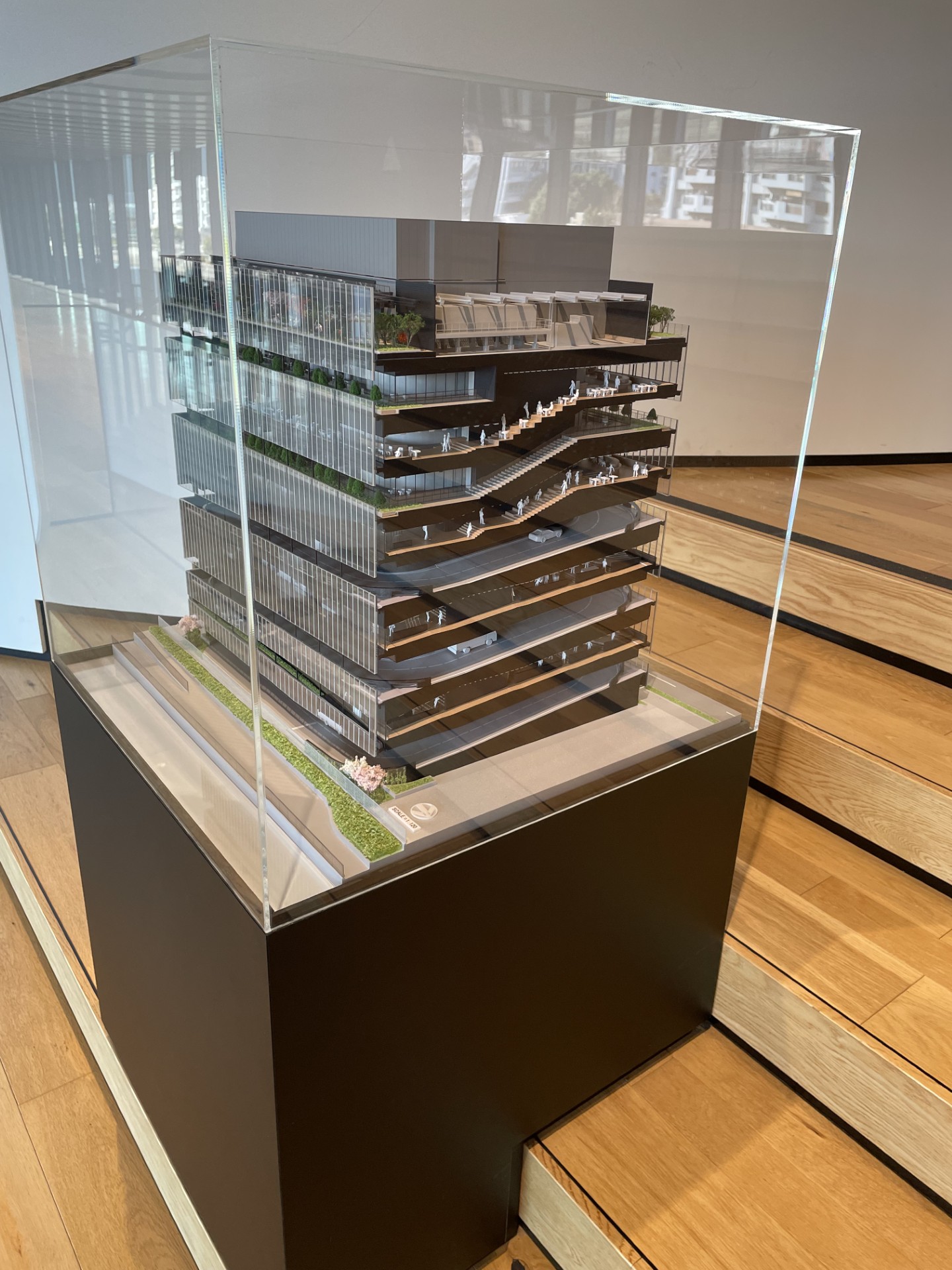 エスカレーターで2階に上がり、総合受付で必要事項を記入すると、6階のミュージアム受付まで案内されます。6階へ上がるエレベーターの手前には、この建物の精巧な模型が展示されていました。