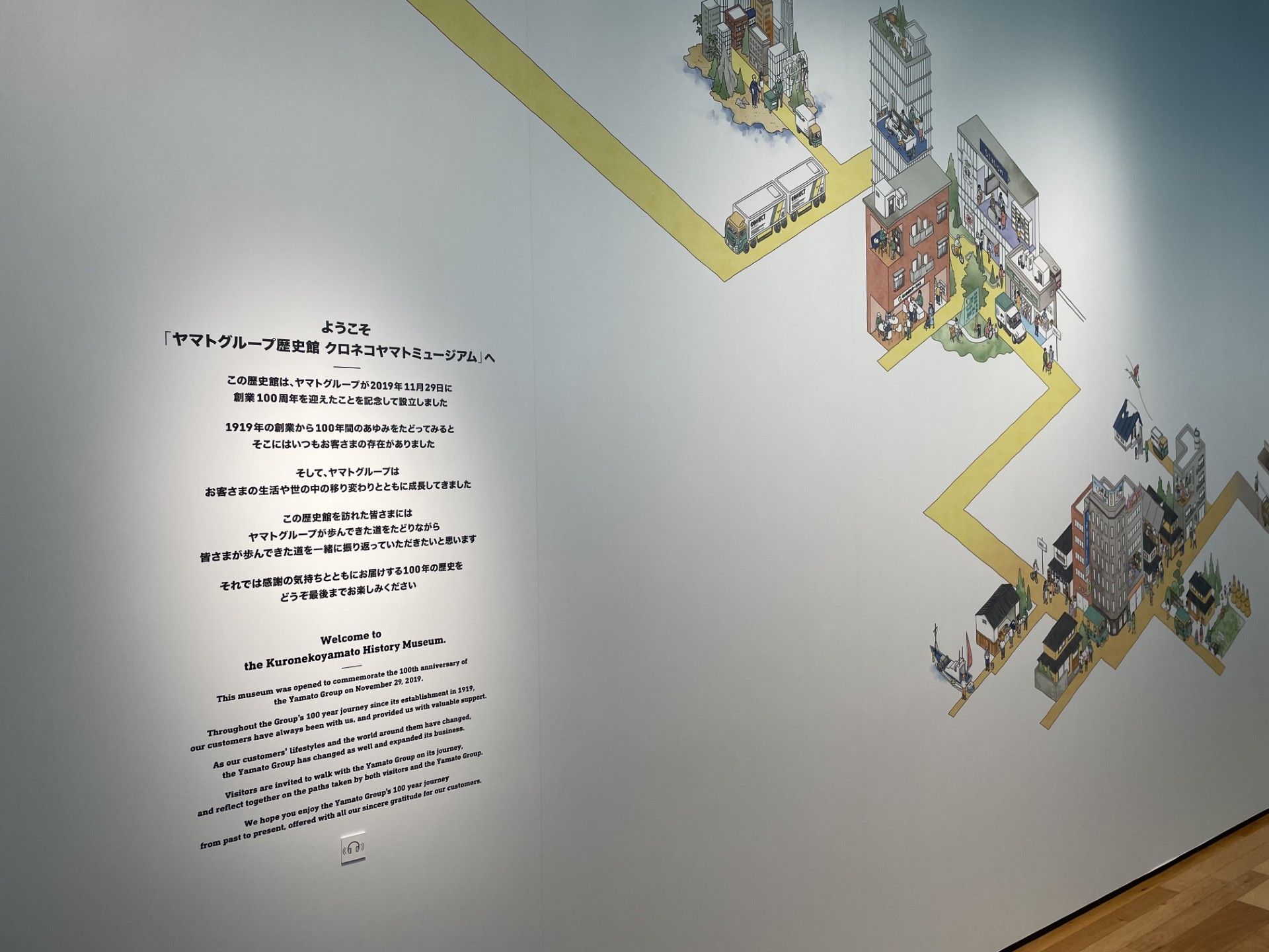 6階の受付から、緩やかなスロープを下りながら、ヤマトグループ100年の歩みを一歩ずつ追体験していきます。