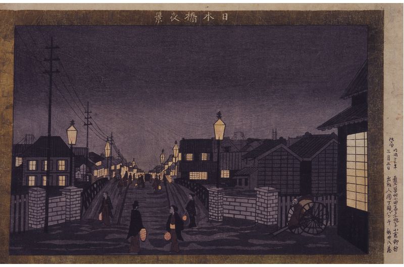 夜、6時の撮影でだいぶ暗いのですが、実際はガス灯のあかりが雪に映えて美しく、レトロな雰囲気というより、ほんとうに昔の街にワープしたようで。小倉柳村の「日本橋夜」のなかにいるようでした。