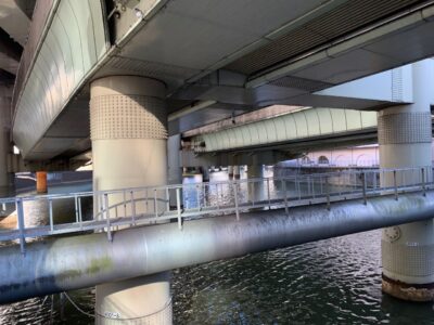 こちらは、現在の風景です。江戸橋から旧渋沢栄一邸方向を見ると、日本橋川には、首都高速道路の高架が覆いかぶさり、ほとんど見えません。往時の景観からはすっかり様変わりしてしまっていますね。
