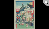 1875(明治8)年1月5日の横浜郵便局開業式の様子を描いています。開業式には、政府要人の他に在留外国人要人も出席し、盛大に催されました。二階バルコニーでは軍楽隊が演奏するなか、正面欄干には花ガスが灯され、その脇には国旗と郵便旗が掲げられています。