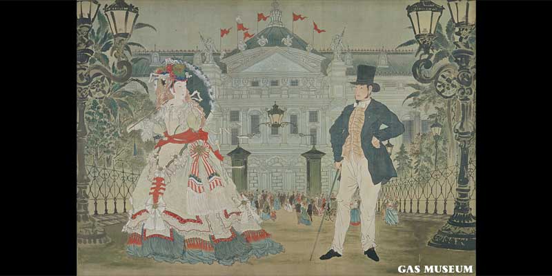 新橋の駅舎前広場の夜景を描いており、当時街中で見られたさまざまな明かりが一同に描かれています。夜空には自然光である月光が、広場中央には二燈立てのガス燈、左端の人力車の脇にはアーク燈、人力車夫の足下に提灯、馬車の馭者席脇には石油ランプによる照明灯が灯り、人々の灯りの利用方法を見ることができます。